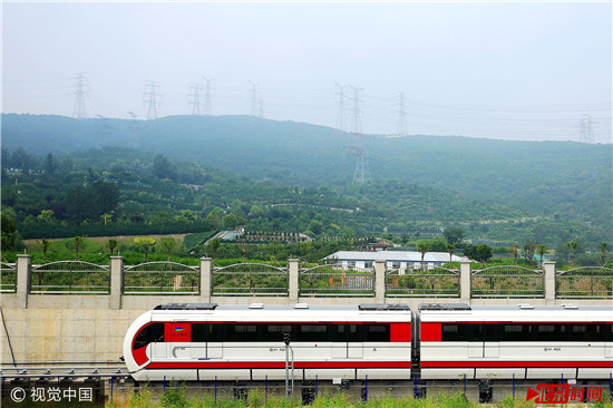 资料图:2017年8月16日,北京地铁首条S1线磁浮列车,在门头沟石门营测试。
