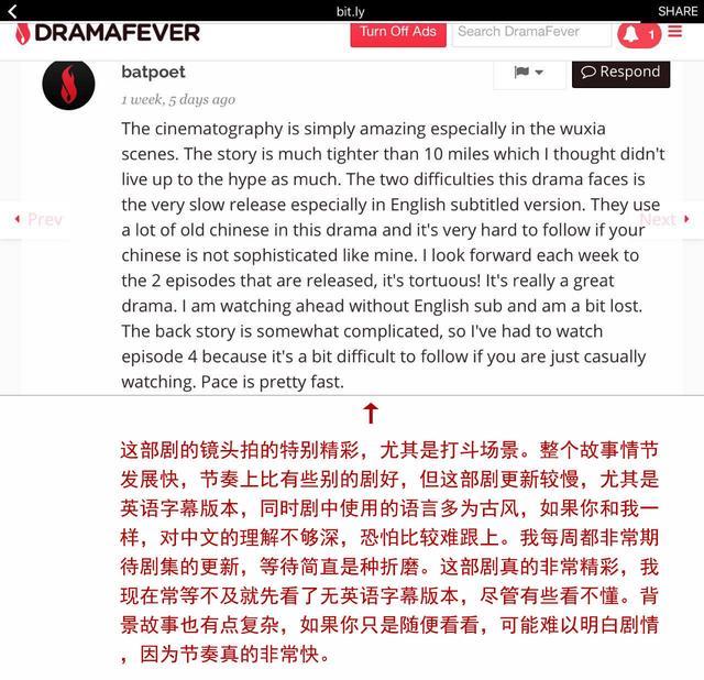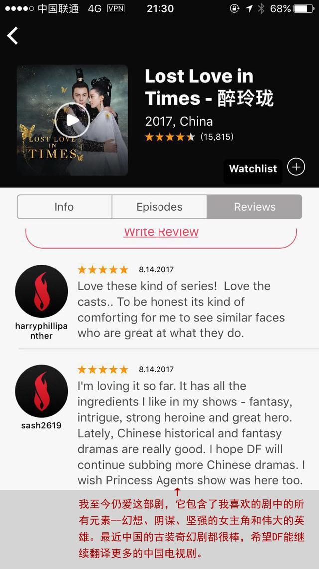 作为时代华纳旗下的主流视频网站,DramaFever以提供亚洲内容为主,囊括了韩国、日本、中国等国家和地区最热门的影视剧目,比如《来自星星的你》、《继承者》等剧目都曾登上该网站的热剧榜。该网站的非亚裔观众高达75%,因此《醉玲珑》在紧贴国内播出的同时,还制作提供了英文字幕,满足了海外主流观众的需求。此外,在评论区里也涌现了大量英语,甚至是西班牙语、葡萄牙语等各国语言评论,且他们毫不吝啬自己的溢美之词,给出了极高的评价及评分。